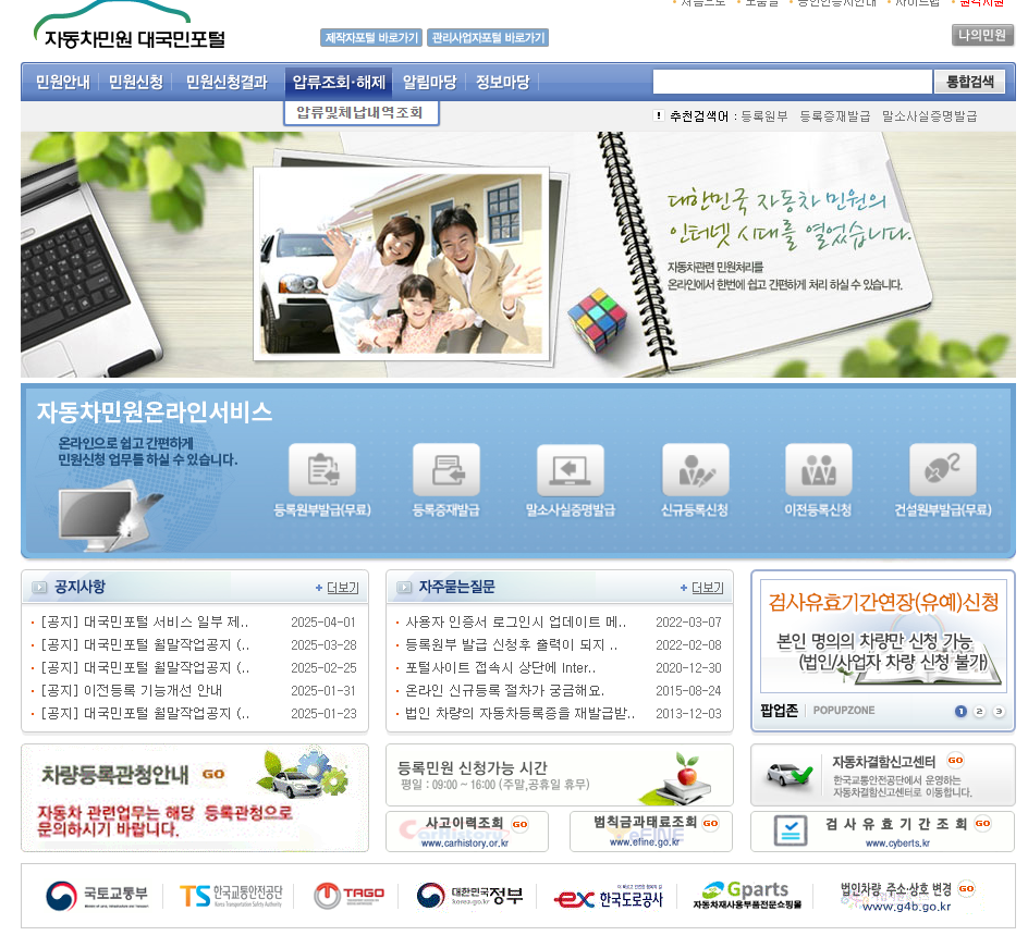 자동차민원 대국민포털은 국토교통부 산하 교통안전공단이 운영하는 자동차 전용 민원포털입니다. 등록증 발급 외에도 검사 예약, 이전 등록 신청, 보험 확인 등 다양한 기능을 제공합니다.